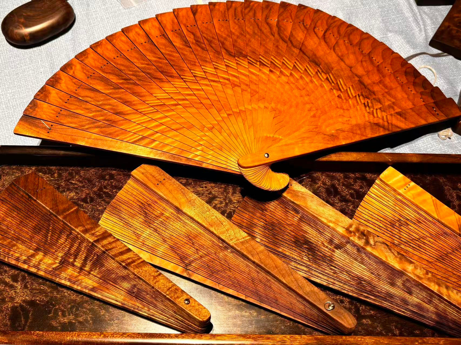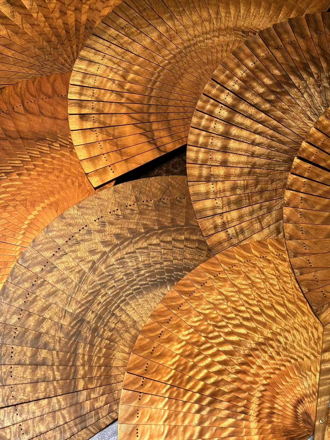 Golden Phoebe (Phoebe zhennan) is renowned for its fine grain and shimmering “golden threads.” Our folding fans are crafted with traditional methods—from timber selection and mortise-and-tenon/riveted structure to multi-stage sanding and wax-oil finishing—so the ribs are strong and the opening/closing is silky-smooth. It’s more than a daily accessory: it’s a keepsake that develops a unique patina over time.
